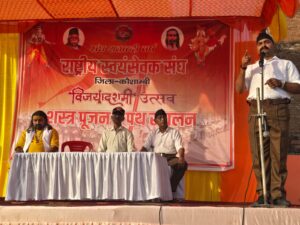 स्वतंत्रता आंदोलन में संघ की महत्वपूर्ण भूमिका सामाजिक राष्ट्रीय कार्यो के बारे में वर्णन करते हुए हिंदू समाज हिंदू संस्कृति हिंदू धर्म के लेकर वर्तमान की स्थिति को को ध्यान में रखकर सम्पूर्ण समाज को देश, राष्ट्र के हित स्वयंसेवक सबको लेकर एक साथ चलता है ।संघ के संस्थापक जन्मजात देशभक्त डॉक्टर हेडगेवार के जीवन की कई घटनाओं का उल्लेख करते हुए अब तक के इतिहार पर प्रकाश डाले l शताब्दी वर्ष मे संघ के द्वारा चलाएं जा रहे हैं विभिन्न प्रकार के कार्यक्रम साथ ही पंच परिवर्तन सामाजिक समरसता, कुटुंब प्रबोधन, नागरिक कर्तव्य, स्व भाव जागरण स्वदेशी और पर्यावरण के संबंध में विस्तार पूर्वक प्रकाश डाला l कार्यक्रम जिला प्रचारक शिव् प्रसाद व धनंजय, संघचालक केदारनाथ, जिला अध्यक्ष रामराज जिला पंचायत अध्यक्ष कल्पना सोनकर जितेन्द्र सोनकर, ज्ञानेंद्र सूबेदार दिलीप विकास मणि संजीवअखिलेश् जी महाराज शारदा कृष्णा मोहन जी आदि भारी संख्या मे स्वयंसेवक उपस्थित रहे